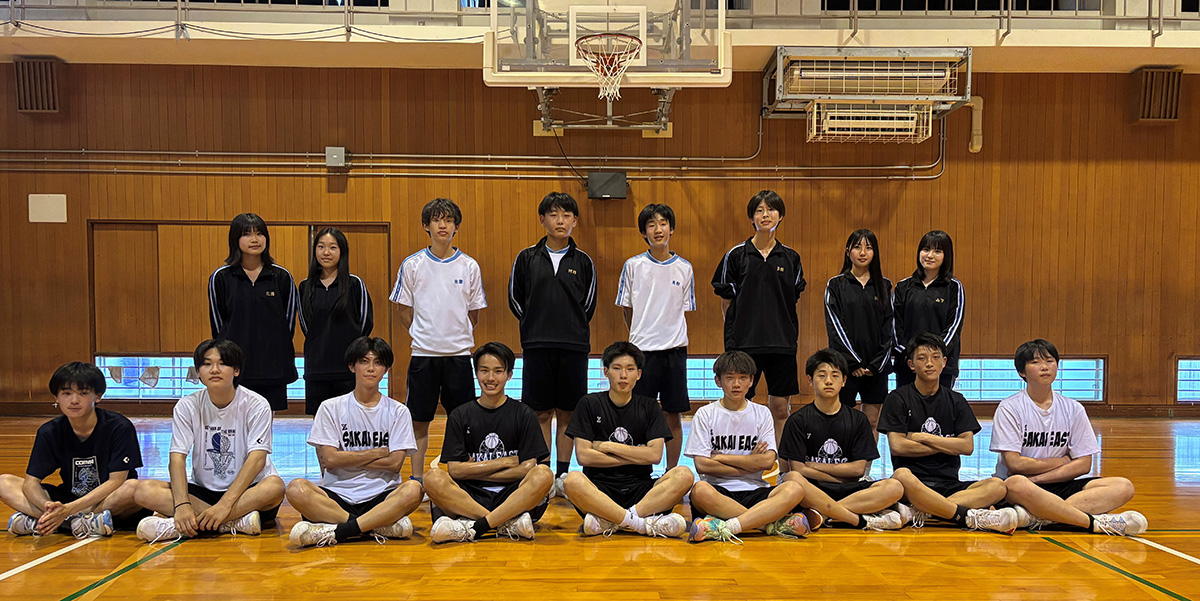 男子バスケットボール部は、令和7年現在、選手が2年生9名、1年生4名、マネージャーが1年生4名で、1つでも多く勝つことを目標に日々活動しています。