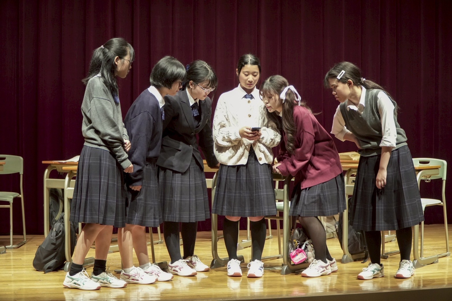 演劇部は、1年間を通じて積極的に公演を行っています。ワークショップへの参加や、他校との交流も盛んに行っています。脚本つくりから演出、大道具作り、音響、照明など、すべて自分たちで話し合って舞台を作り上げています。それぞれの代ごとの個性が反映されながらも、「等身大の私たち」を伝える作品を送り出しています。